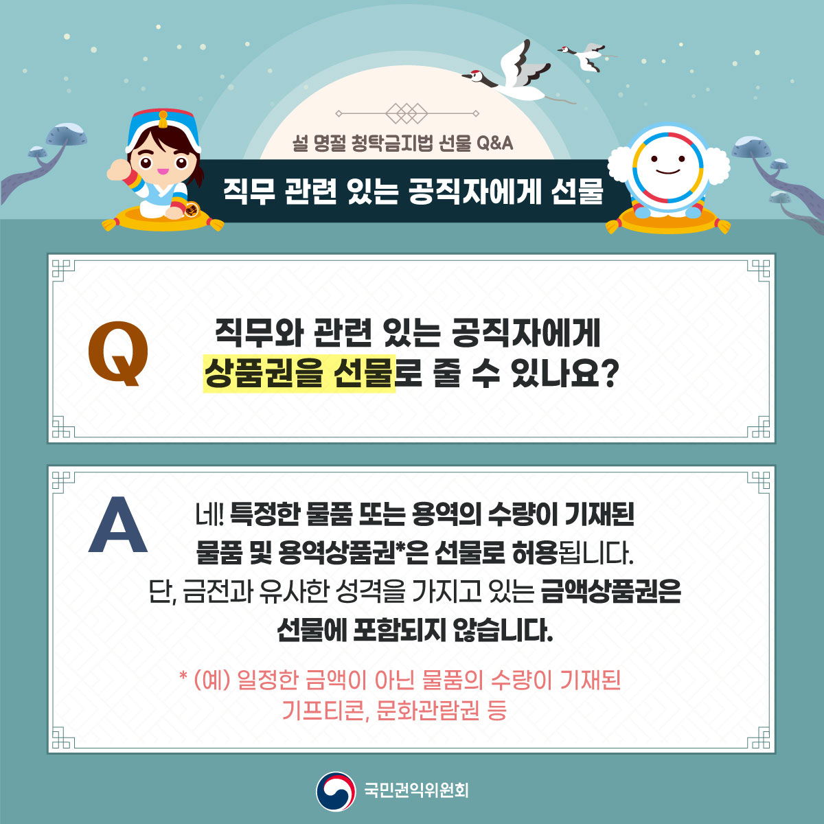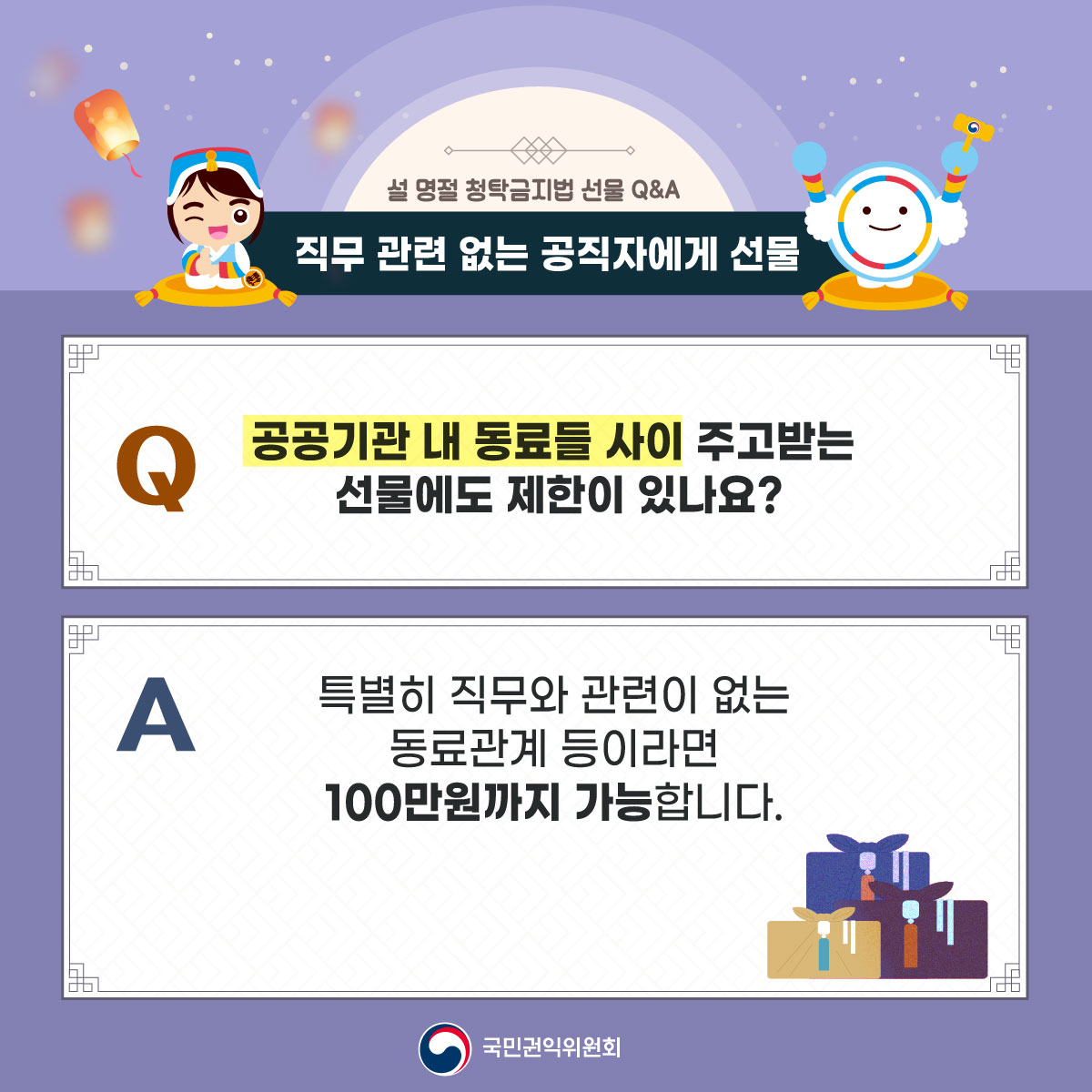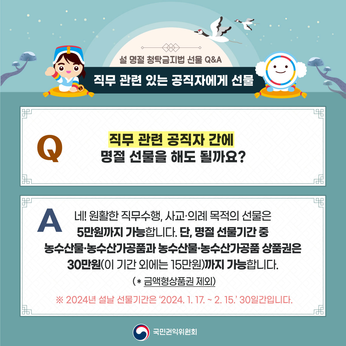 ? 공직자가 아닌 자에게 제공하는 선물은 금액 제한이 없으며, 직무 관련이 없는 공직자에게는 100만원 이하의 선물 가능 ? 직무 관련 공직자에게 원활한 직무수행, 사교·의례 목적의 5만원 이하 선물은 가능, 다만, 명절 선물기간에 한해 농수산물·농수산가공품과 농수산물·농수산가공품 상품권은 30만원까지 허용 ※ 상향된 선물가액이 적용되는2024년 설날 선물기간은 '24.1.17.(수)~ 2.15.(목) ? 법 시행령 개정(2023.8.30.)으로 선물 범위에 물품 및 용역상품권(금액상품권 제외) 포함 |