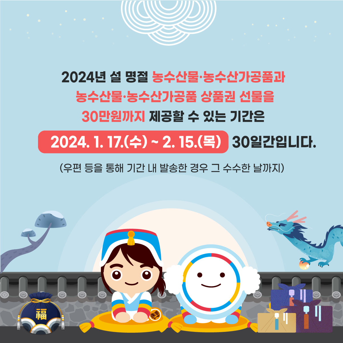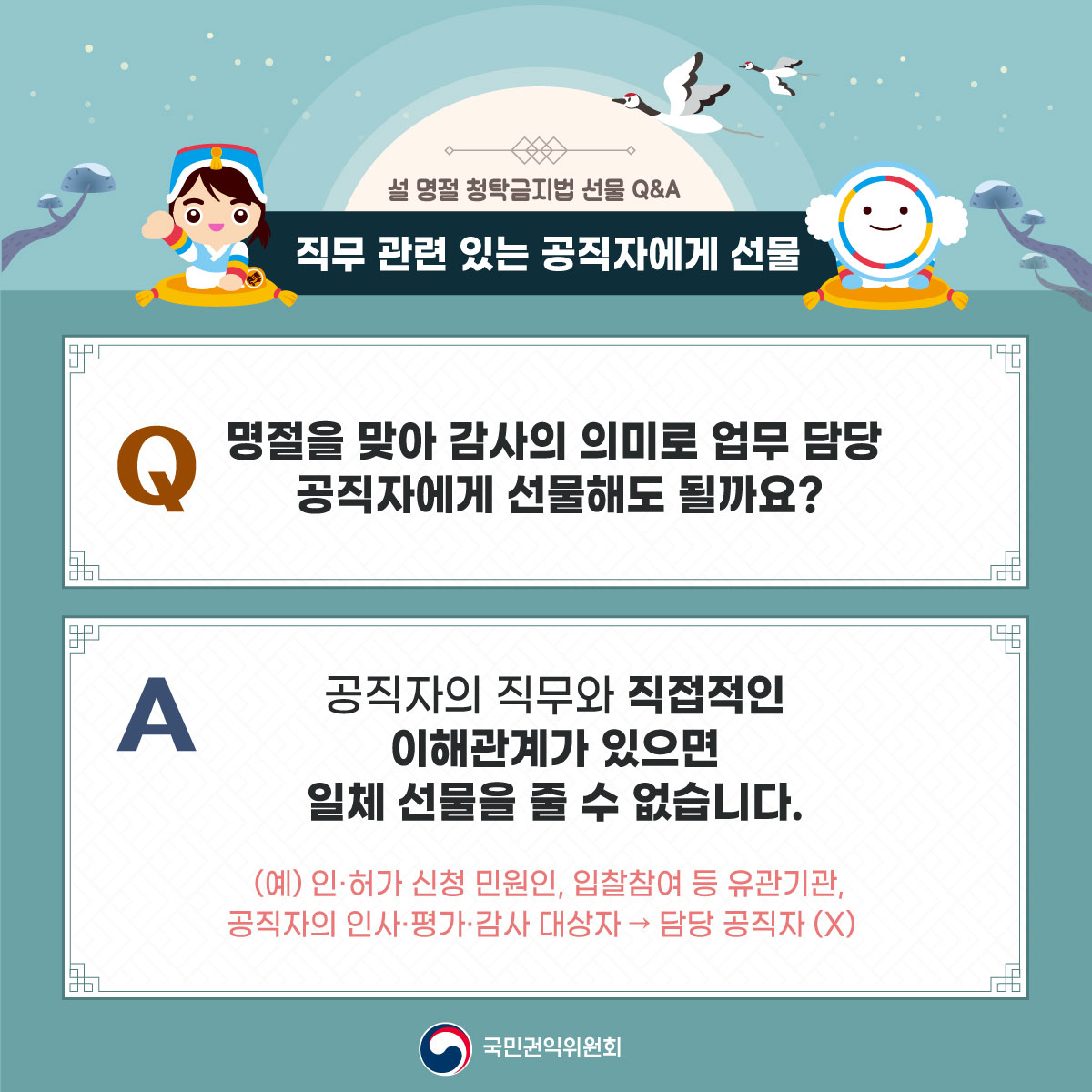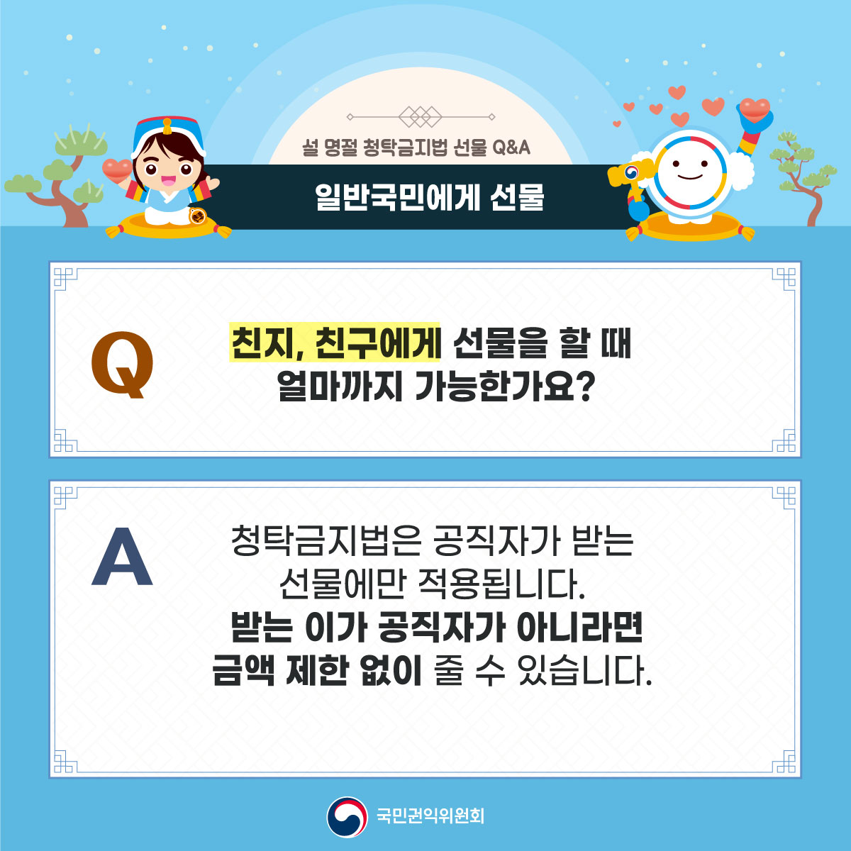 ? 공직자가 아닌 자에게 제공하는 선물은 금액 제한이 없으며, 직무 관련이 없는 공직자에게는 100만원 이하의 선물 가능 ? 직무 관련 공직자에게 원활한 직무수행, 사교·의례 목적의 5만원 이하 선물은 가능, 다만, 명절 선물기간에 한해 농수산물·농수산가공품과 농수산물·농수산가공품 상품권은 30만원까지 허용 ※ 상향된 선물가액이 적용되는2024년 설날 선물기간은 '24.1.17.(수)~ 2.15.(목) ? 법 시행령 개정(2023.8.30.)으로 선물 범위에 물품 및 용역상품권(금액상품권 제외) 포함 |
